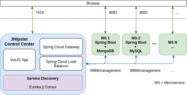This is a standard web application that connects to one or several JHipster applications through their management API endpoints. Those management endpoints can either be exposed on the standard API port (typically 8080, 8081, ...) or preferably on a dedicated management port (typically 9999) so that they are isolated from the outside world.
