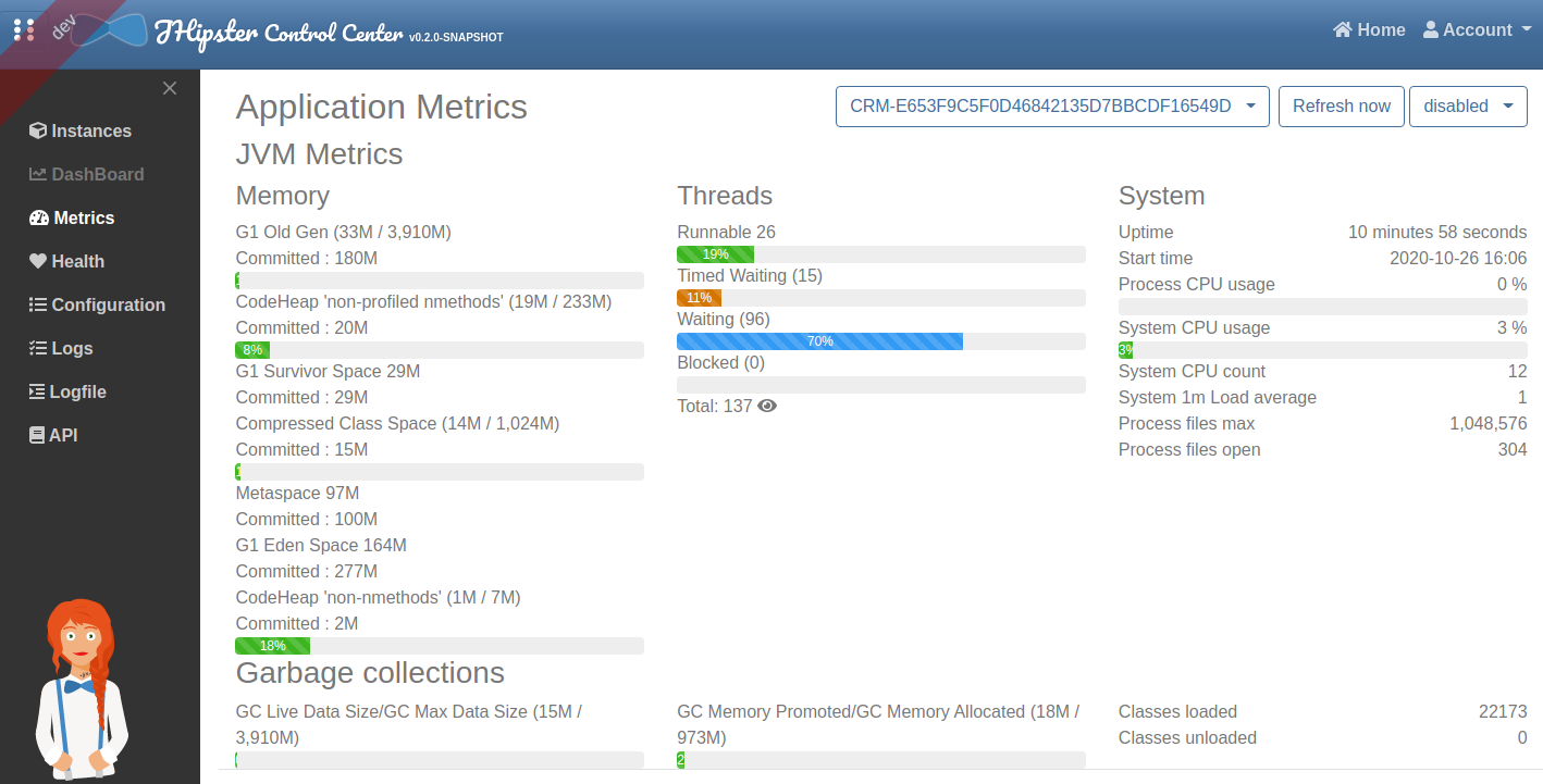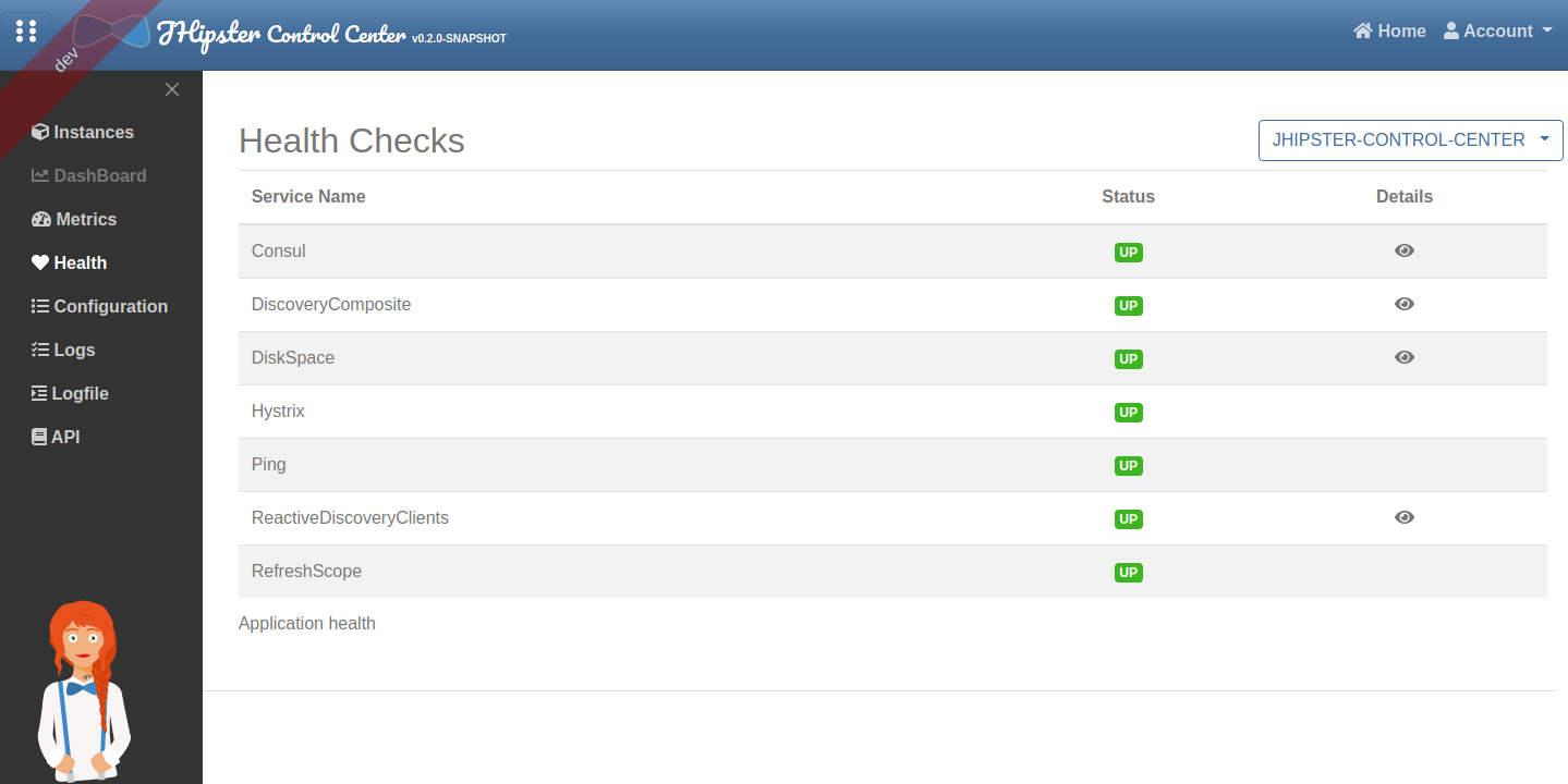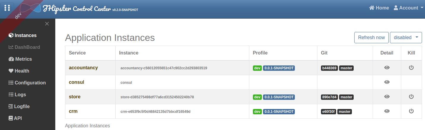 The JHipster Control Center provides a list of application's instances. As soon as an application registers on a server (consul or eureka), it will become available in the list.